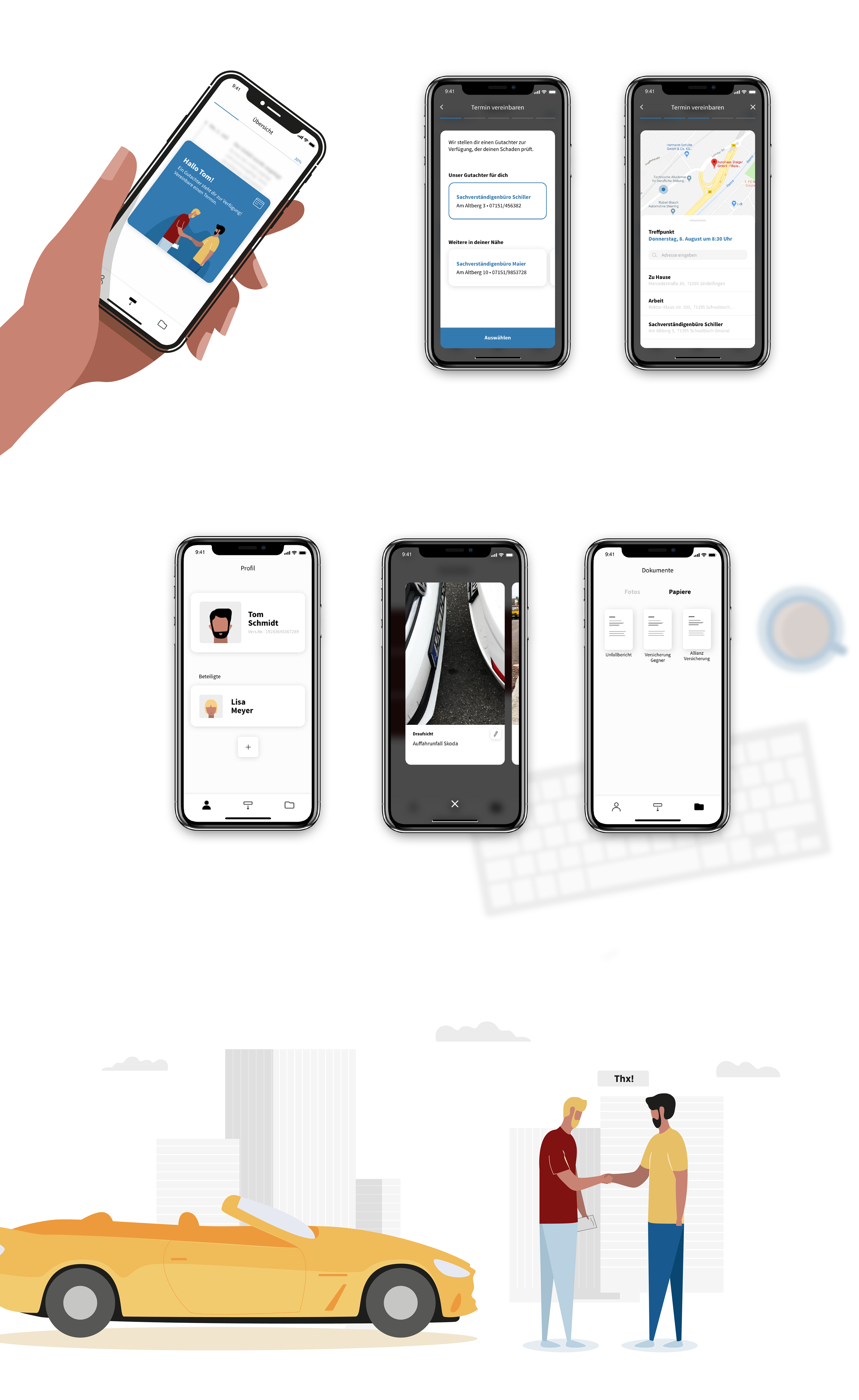 Die App als Service Design bietet dir Unterstützung in allen Bereichen. Wir zeigen dir deine To-Do´s und informieren dich über den aktuellen Status. Mit AllianzSupport wird dir der Kontakt zu Beteiligten des Unfalls, aber auch zur Versicherung oder dem Gutachter erheblich erleichtert. Mit wenigen Klicks kannst du einen Termin vereinbaren. Deine Fotos und analogen Papiere werden digital gesammelt. Die Dateien aller Beteiligten kommen hier zusammen. Du musst also nicht mehr lange nach alten Unterlagen suchen.