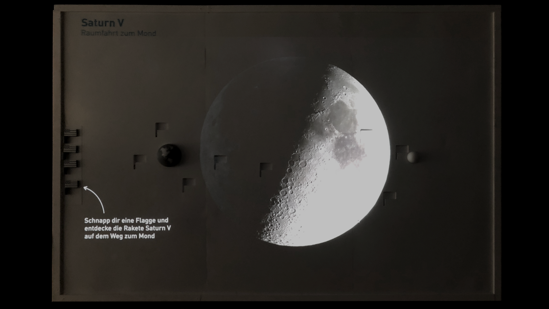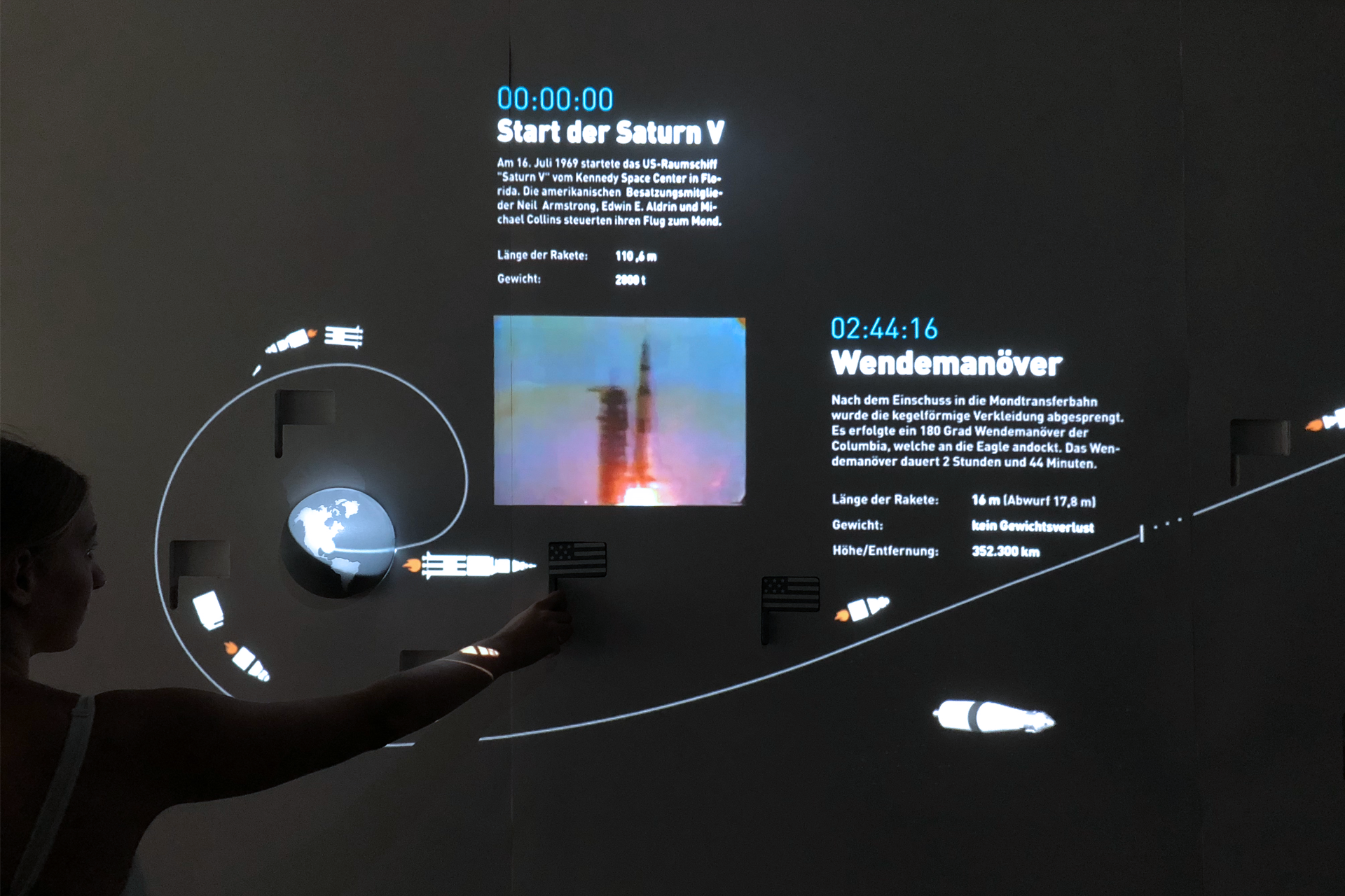 Jeder Meilenstein kann mit einer Flagge als Auslöser angewählt werden. Ein Steckbrief über dieses Ereignis, sowie eine Animation oder Film erklären die Situation. Bis zu acht Personen können diese Wand gleichzeitig bedienen.