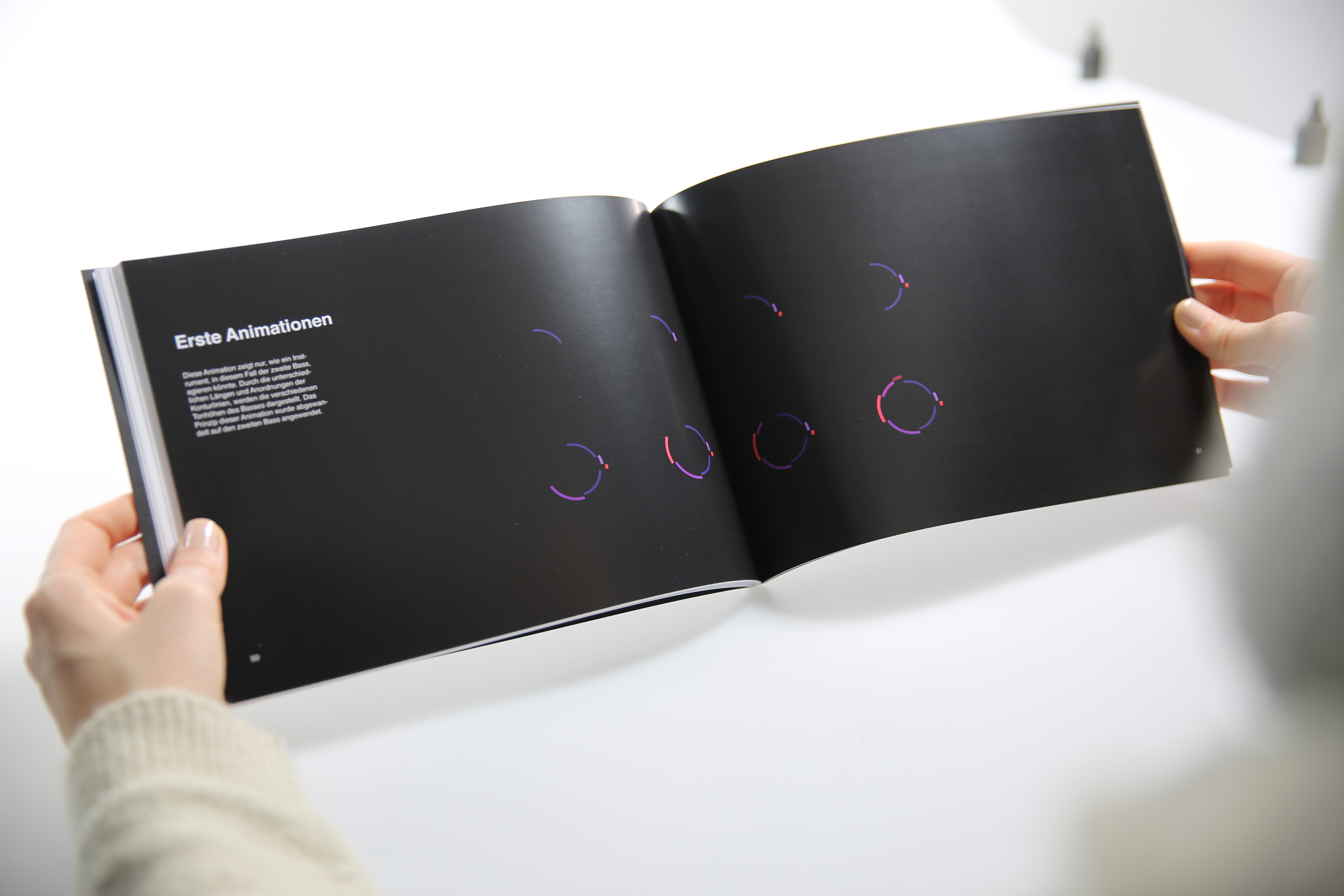 Unsere Dokumentation zeigt eine analoge Version der Animation. Jede einzelne Ebene stellt ein Musikinstrument unseres Musikstückes dar und kann gedreht werden.