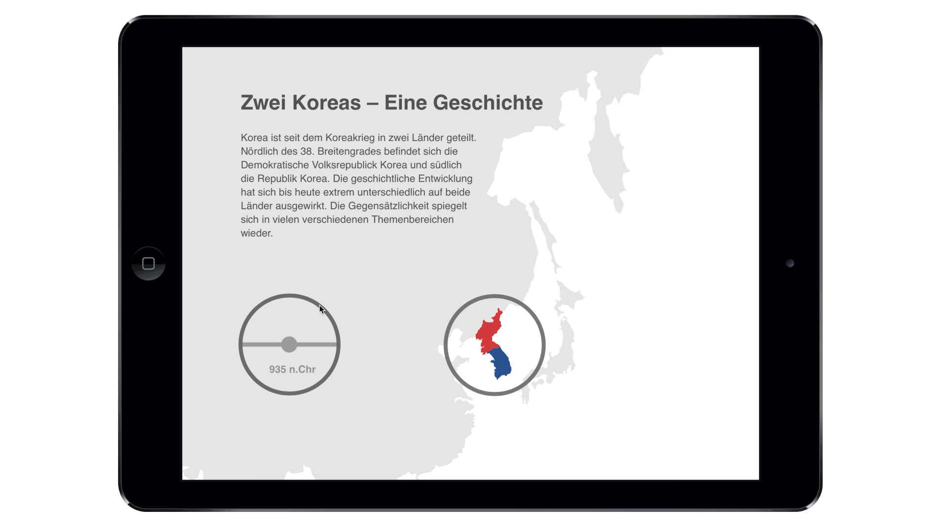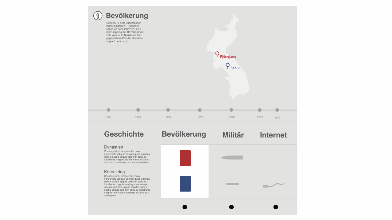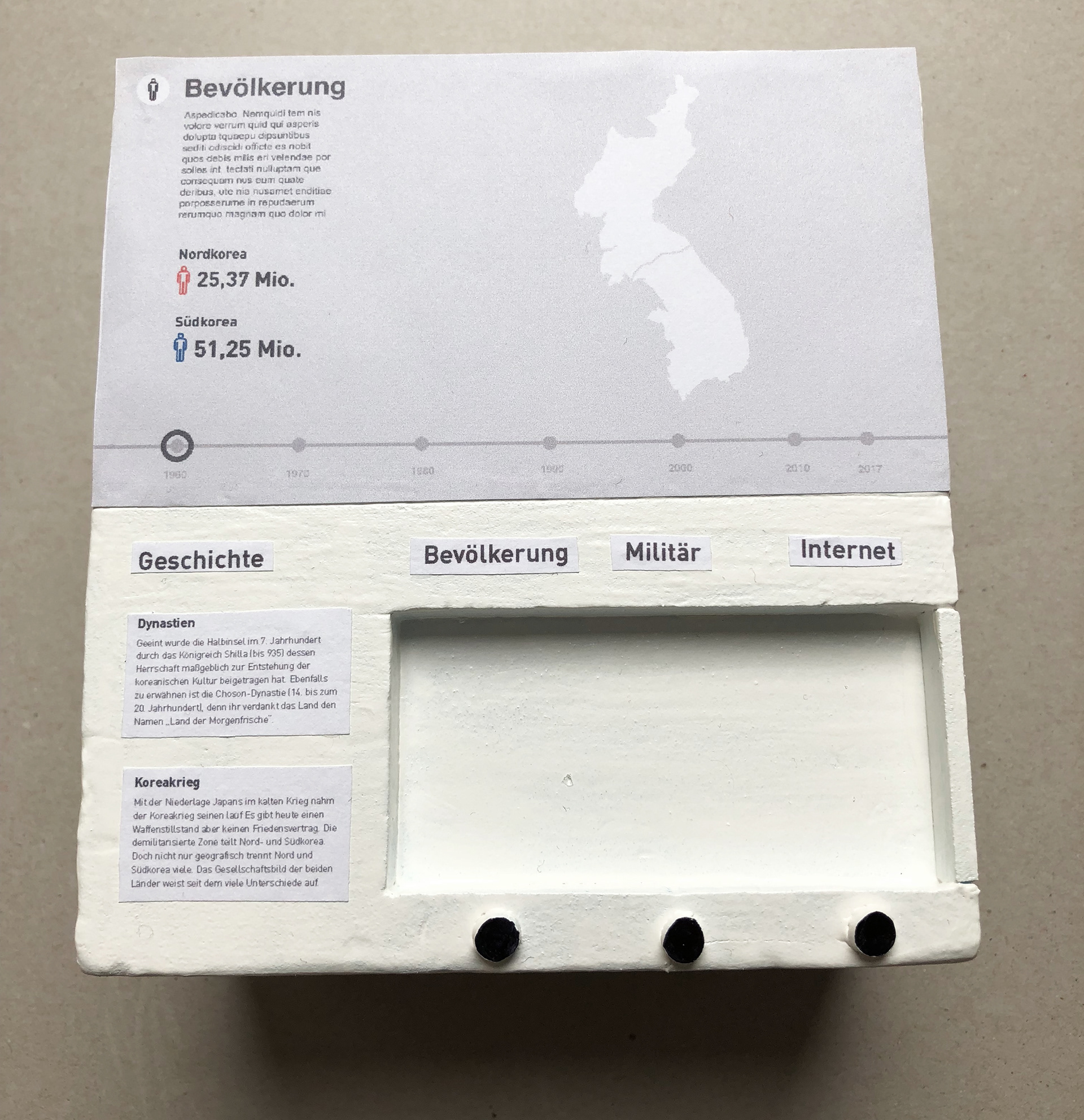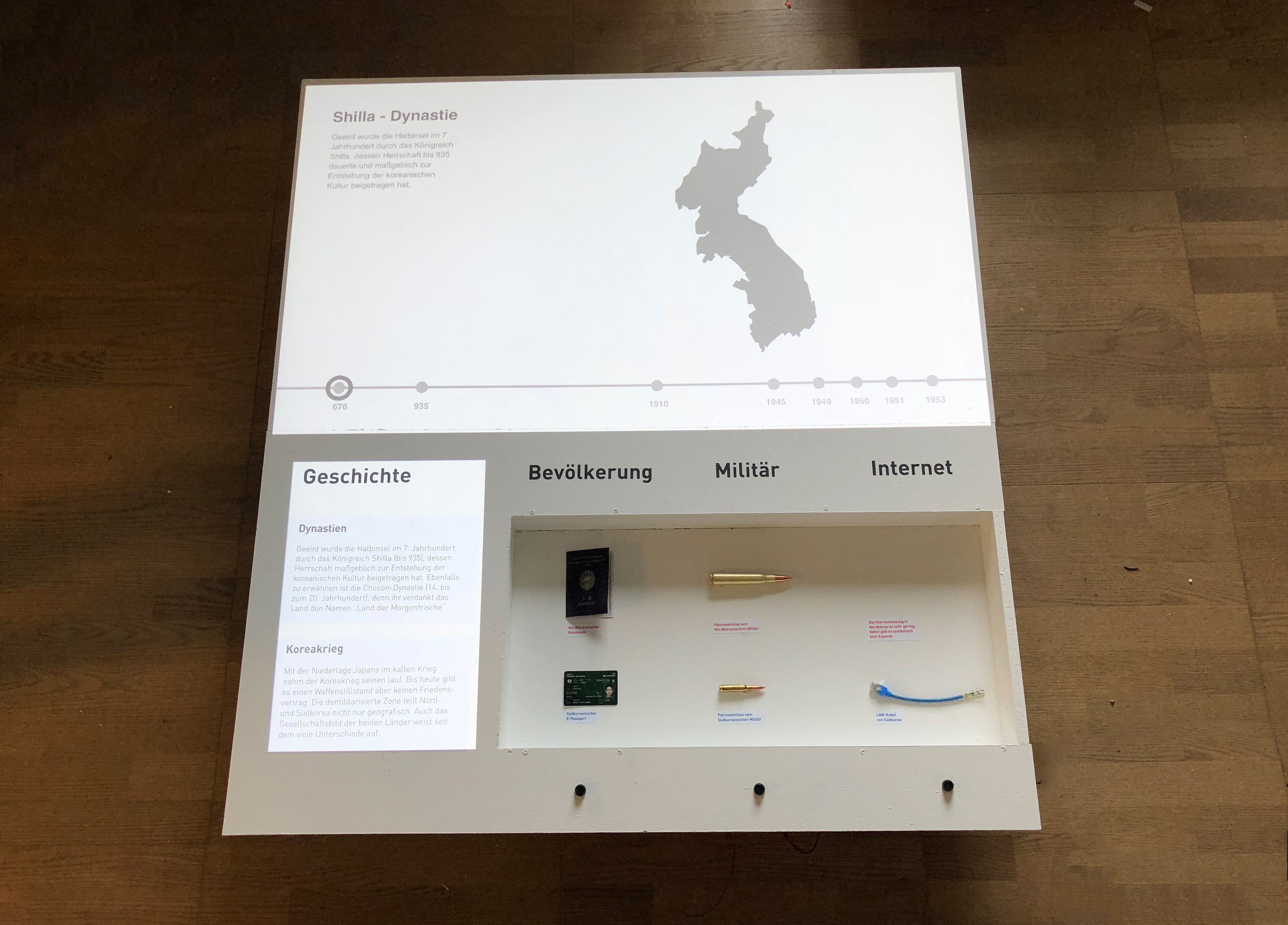 Based on the book concept, a concept of an exhibition situation should be visualized. The foundation is one or more exhibits which should be integrated into the topic. Some subject areas of the book concept are transferred, supplemented and interactively prepared for the visitor. The visualization of the concept is implemented through a 1:10 model and a 1: 1 model. The history of Korea is shown in idle mode. By selecting the buttons, the comparison between North and South Korea is shown.