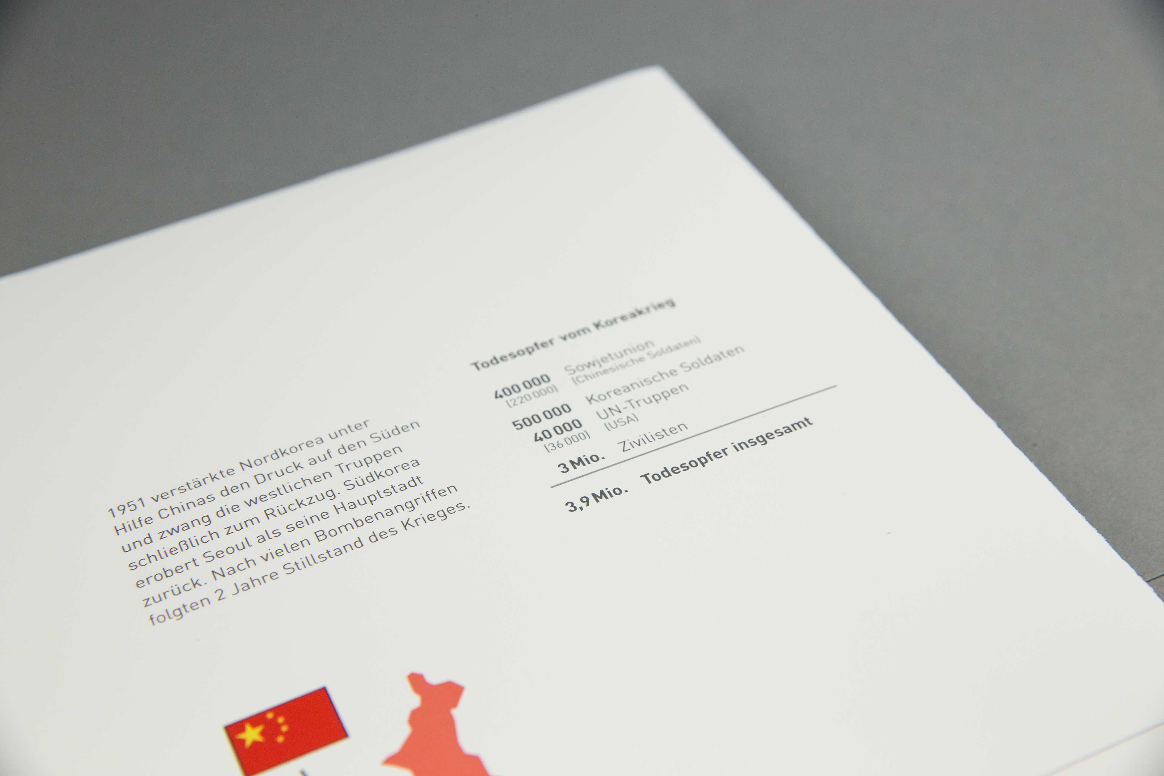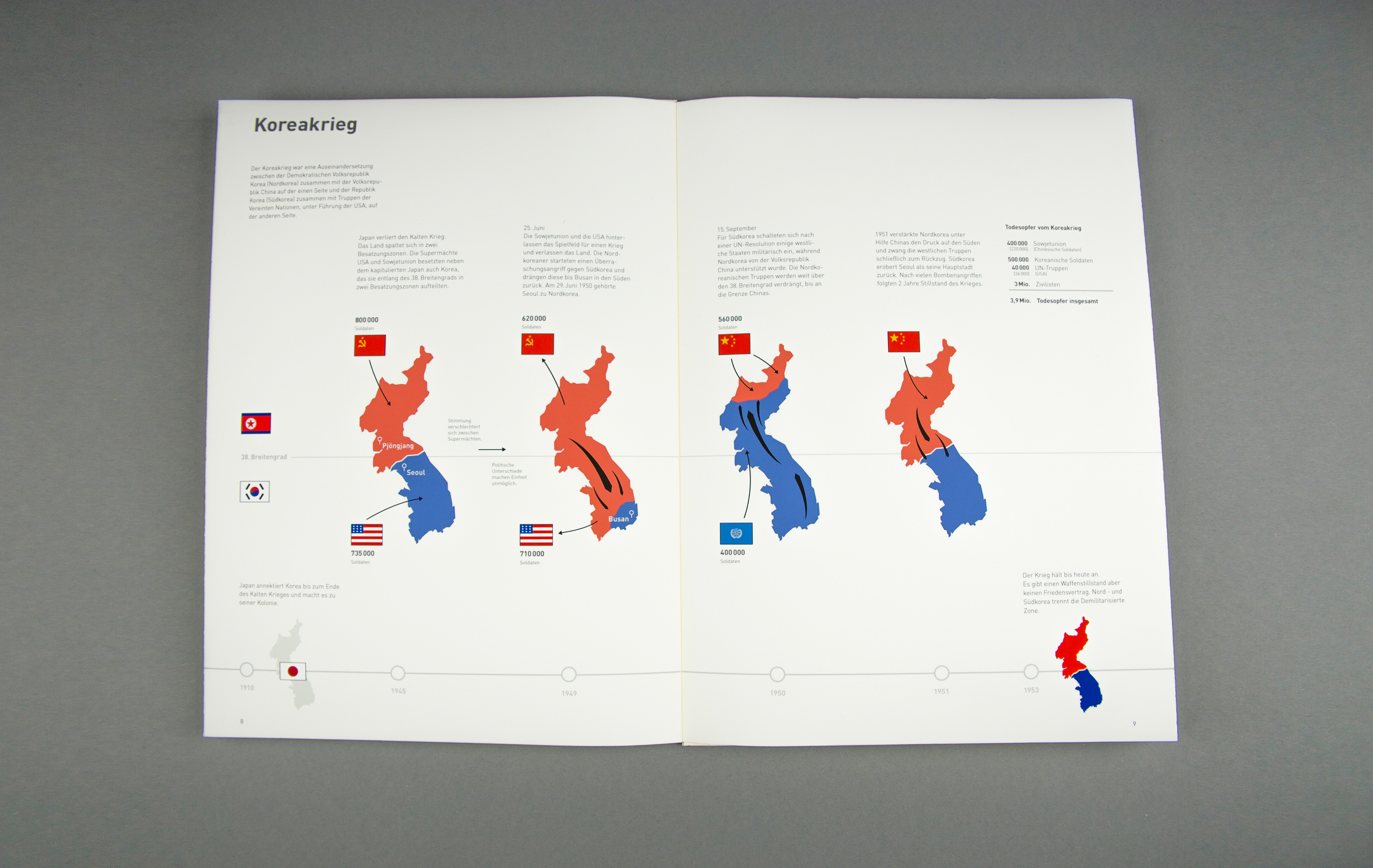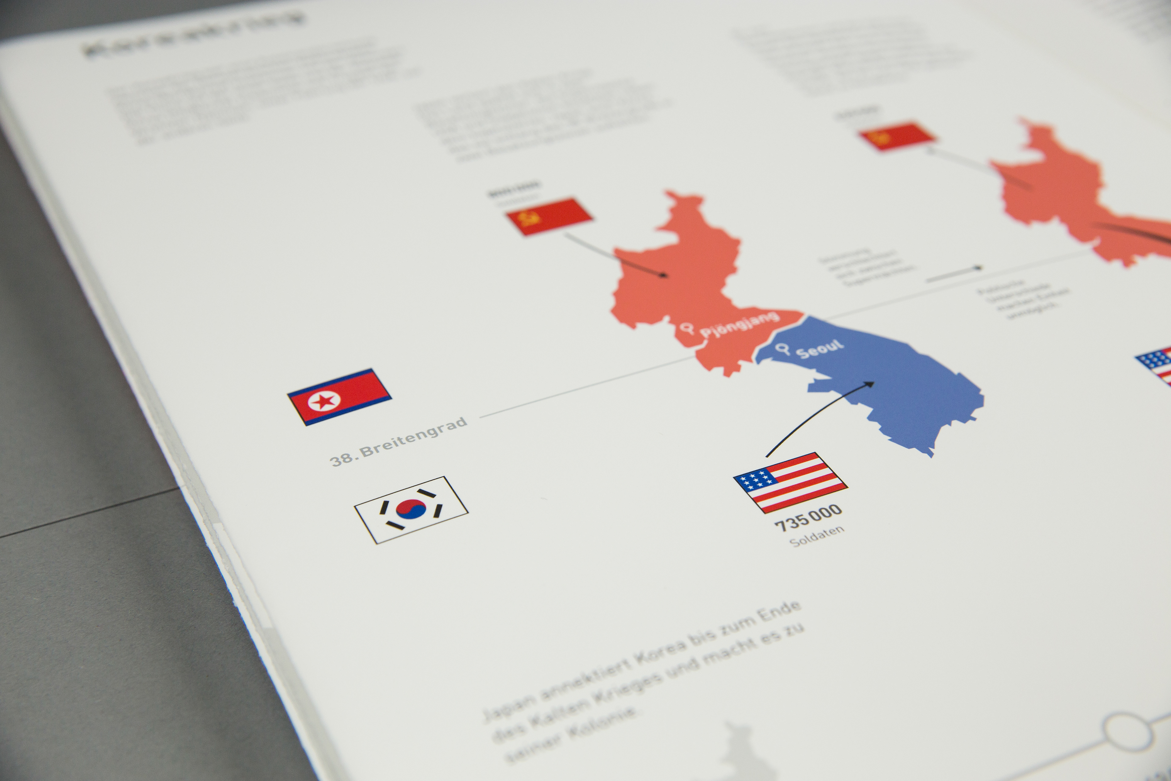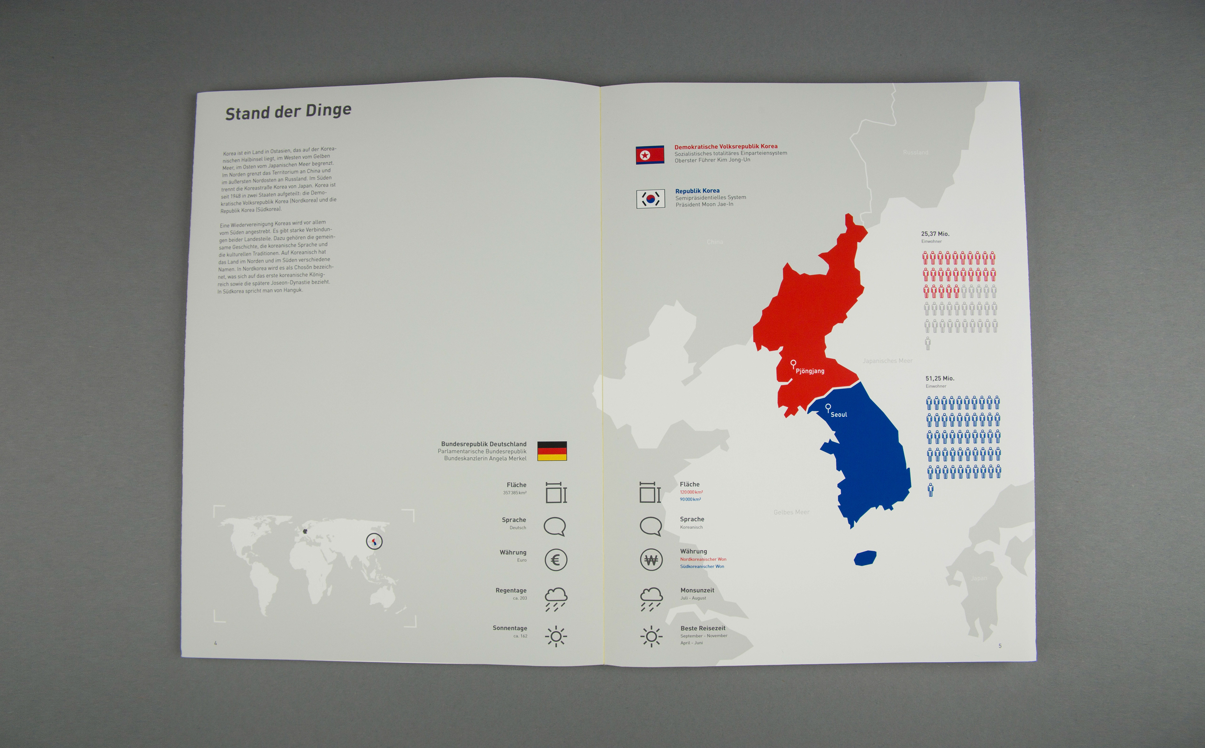Based on the book concept, a concept of an exhibition situation should be visualized. The foundation is one or more exhibits which should be integrated into the topic. Some subject areas of the book concept are transferred, supplemented and interactively prepared for the visitor. The visualization of the concept is implemented through a 1:10 model and a 1: 1 model. The history of Korea is shown in idle mode. By selecting the buttons, the comparison between North and South Korea is shown.