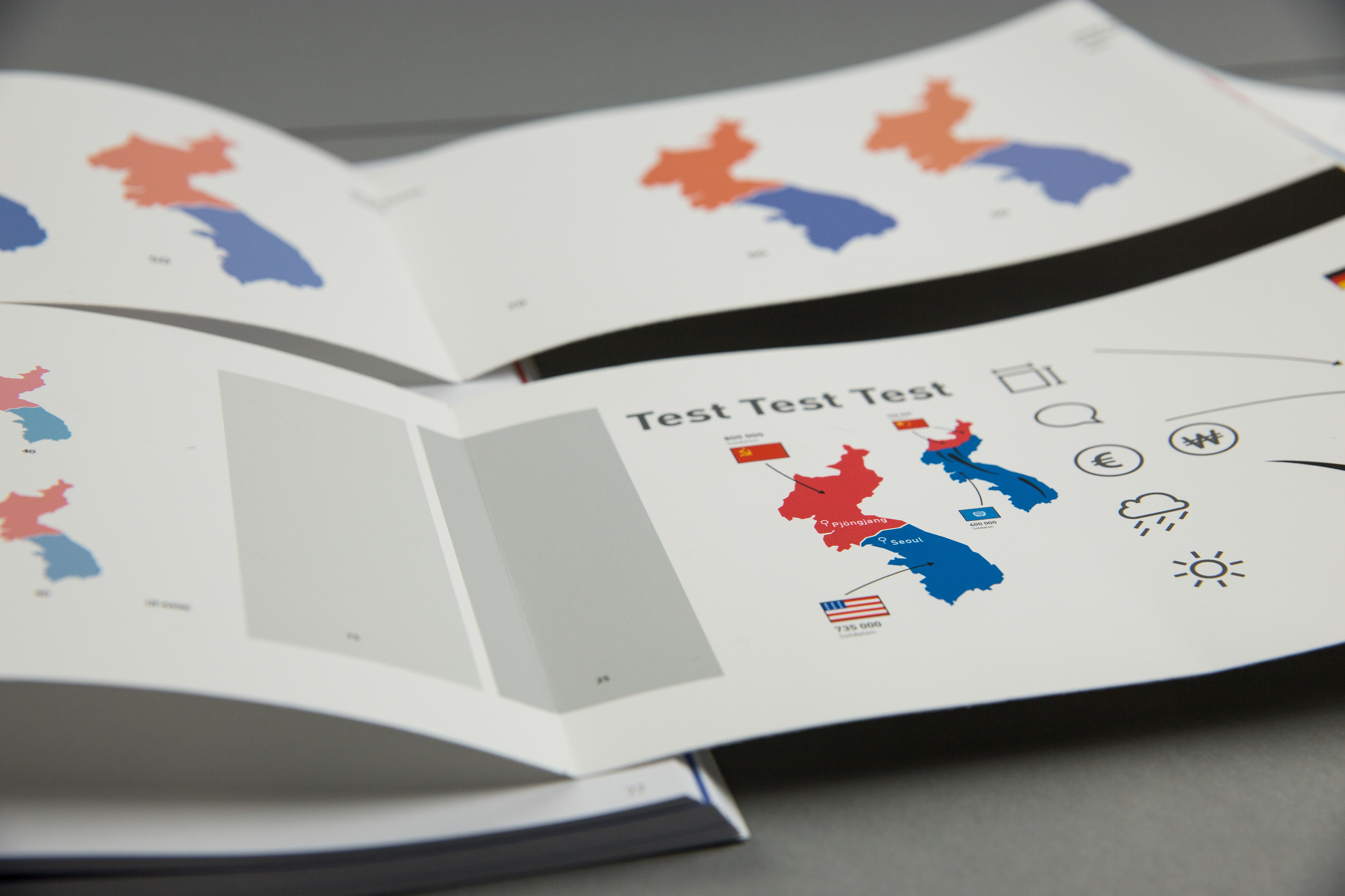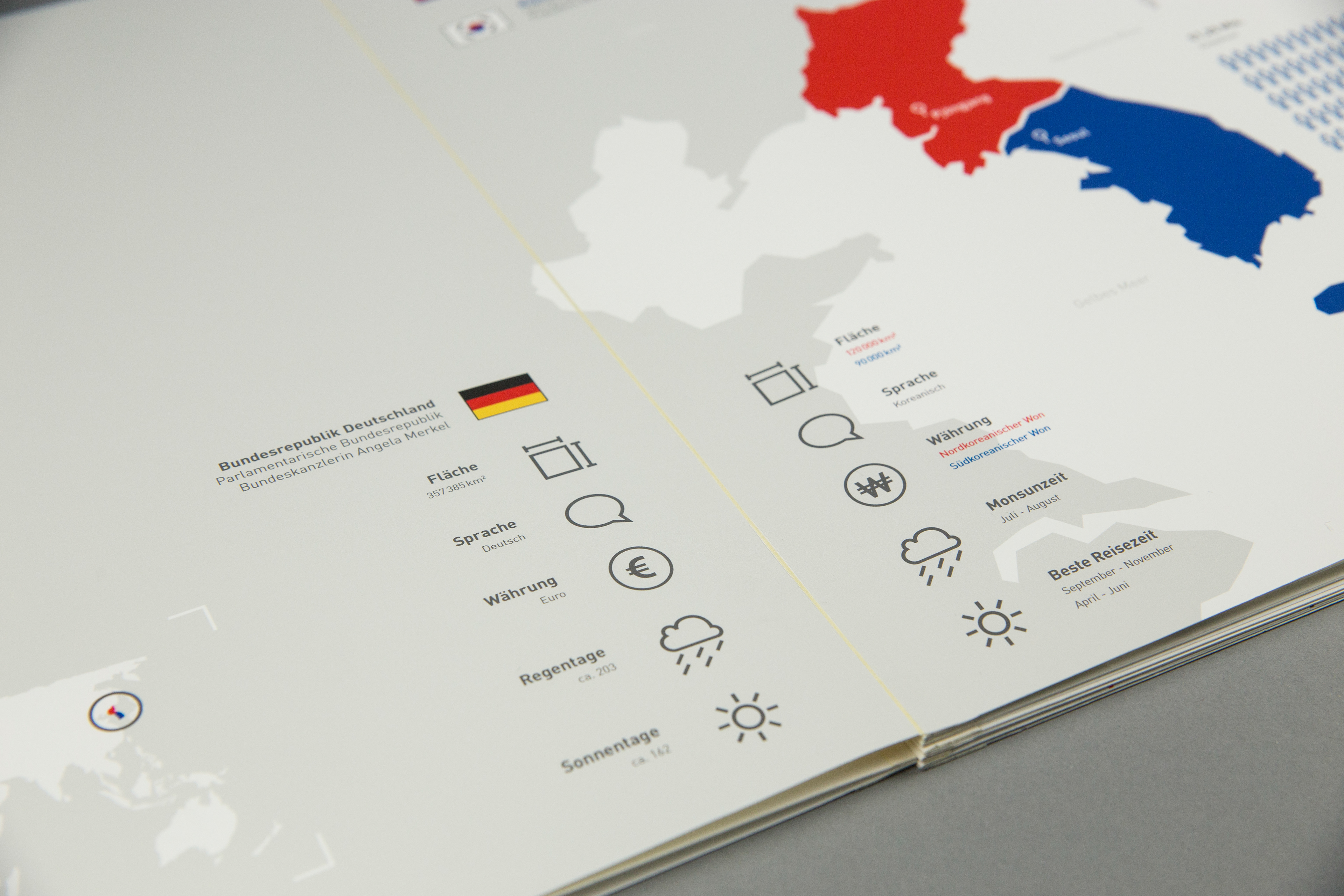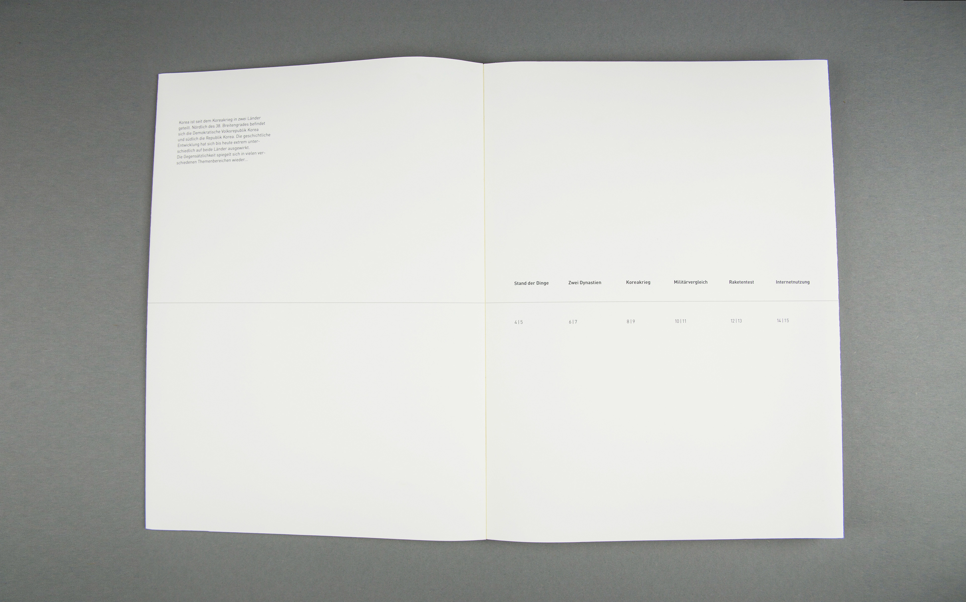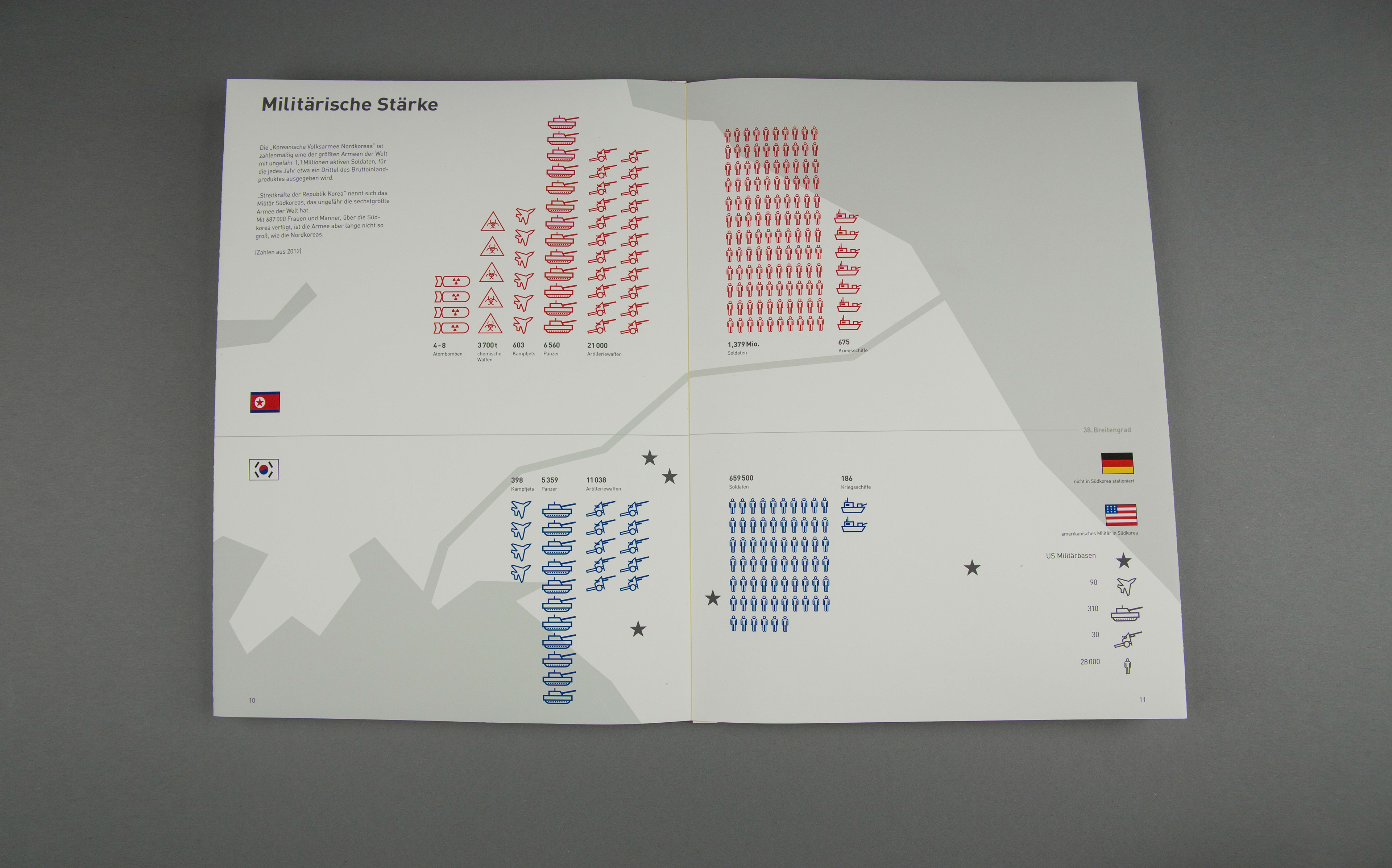Based on the book concept, a concept of an exhibition situation should be visualized. The foundation is one or more exhibits which should be integrated into the topic. Some subject areas of the book concept are transferred, supplemented and interactively prepared for the visitor. The visualization of the concept is implemented through a 1:10 model and a 1: 1 model. The history of Korea is shown in idle mode. By selecting the buttons, the comparison between North and South Korea is shown.