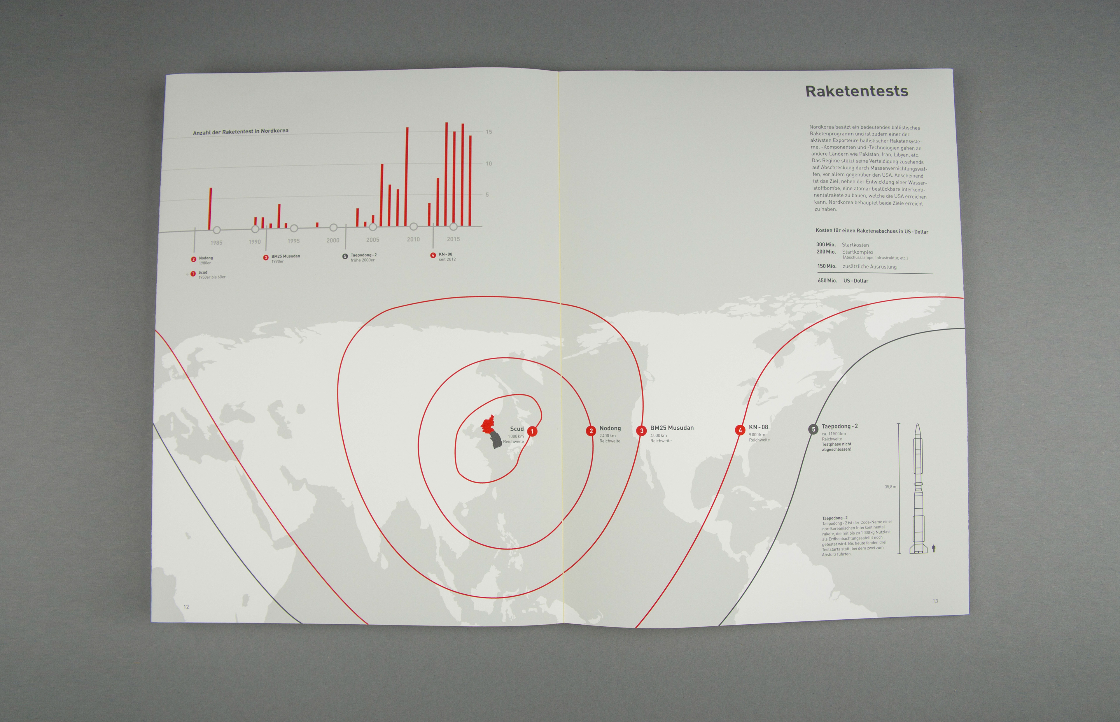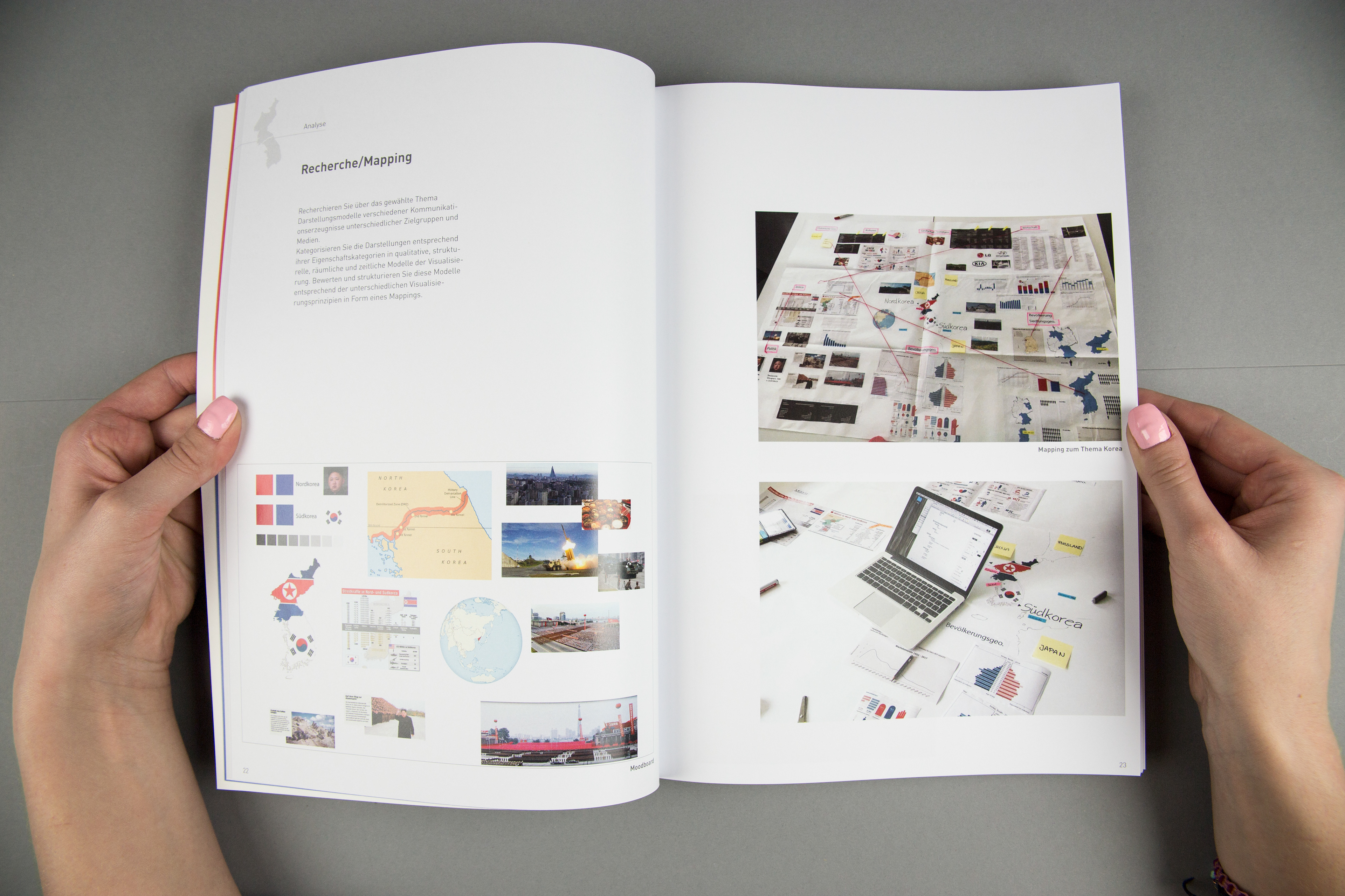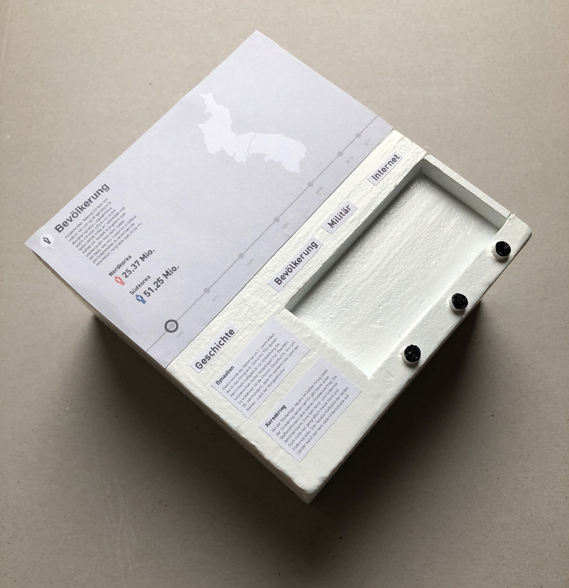Ausgehend vom Buchkonzept soll ein Konzept einer Ausstellungssituation visualisiert werden. Grundstein bildet ein/mehrere Exponate die zum Thema eingebunden werden sollen. Einige Themenbereiche des Buchkonzeptes werden übertragen, ergänzt und für den Besucher interaktiv aufbereitet. Die Konzeptvisualisierung findet mit einem 1:10-Modell und einem 1:1-Modell statt. Die Gesichte Koreas wird im Idle-Modus gezeigt. Über das Anwählen der Taster wird der Vergleich zischen Nord- und Südkorea zu einem Thema gezeigt.